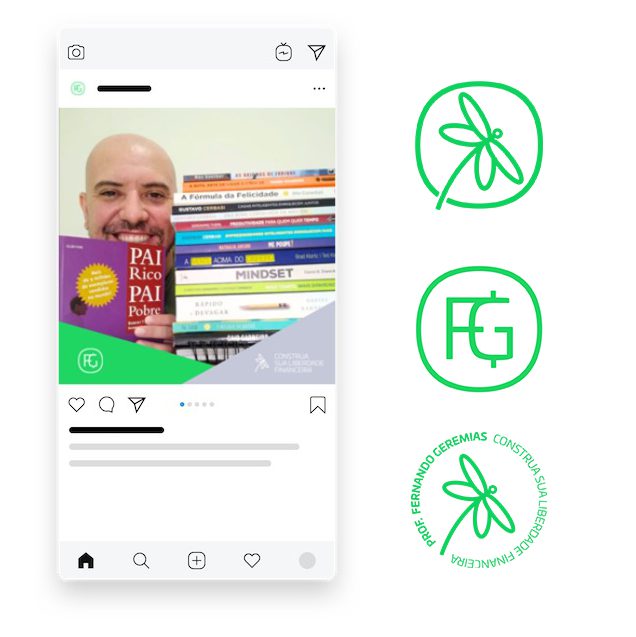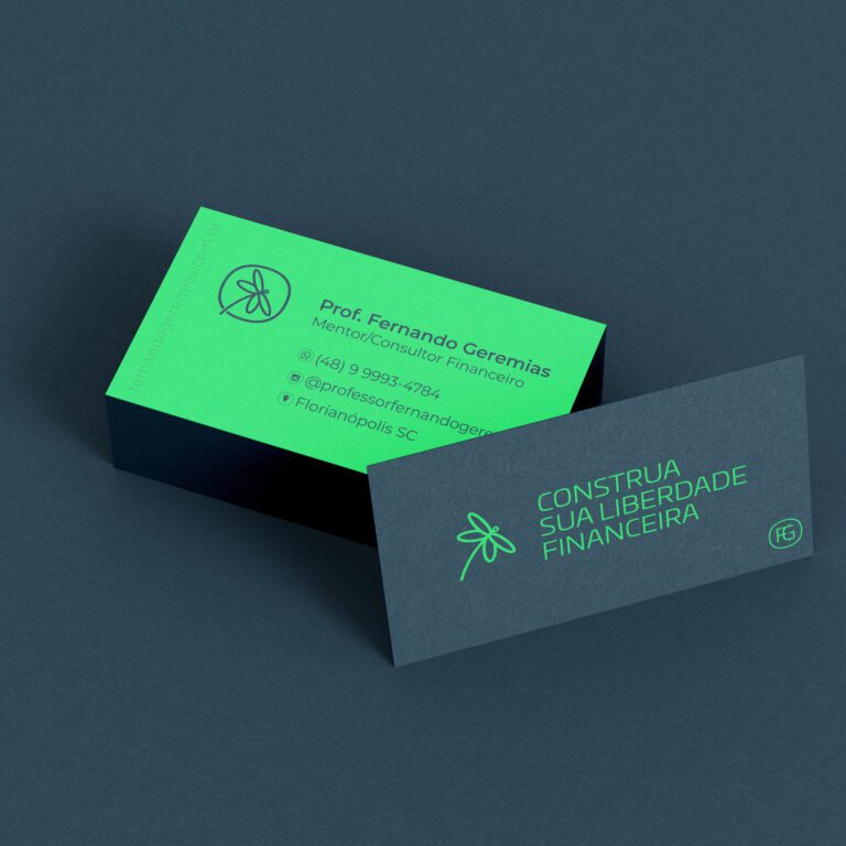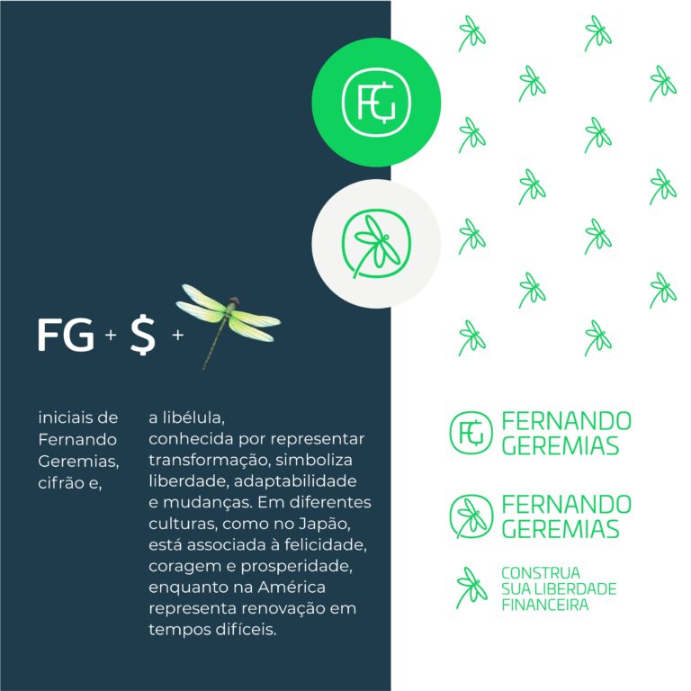 A pesquisa partiu para um símbolo e chegamos na libélula. Símbolo de transformação, as libélulas são como as pessoas que são orientadas e voam rumo a liberdade financeira. As iniciais do professor, entrelaçadas com o cifrão, formam um logotipo que fusiona elegância e prosperidade. Uma linguagem visual para uma jornada financeira, onde compartilhar conhecimento é uma experiência cuidadosamente construída, enraizada em profissionalismo e comprometimento. O verde vibrante faz referência ao verde de uma “conta com saldo”, “investimento positivo” e “liberdade”, e o azul marinho traz seriedade e conexão ao mundo da educação e dos negócios.